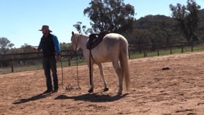 Using long reining to soften this very braced horse who has a long racing history. Great explanations for the long reins, teaching trotting to backing and to stop pushing
